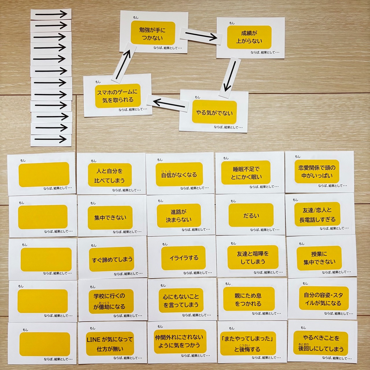 それらの望ましくない状態が起これば、次にどんな望ましくない状態がち起こるのかを考えて、因果関係を表す矢印で繋いでいくだけのゲームです。